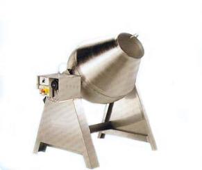 Конусообразный смеситель представляет собой два конуса соединенных межу собой цилиндрической обечайкой, загрузка и выгрузка продукта может осуществляться как через один люк, так и через разные люки. Но наиболее удобный вариант это загрузка через люк а выгрузка через шибер, либо поворотную задвижку. Внутри барабана могут быть оборудованы направляющие. Перемешивание происходит за счет периодического распределения, группировки (расгруппировки) перемешиваемой массы во время вращения барабана. Скорость вращения барабана регулируется от 0,5 до 25 об/мин. Идеально подходит для смешивания нескольких сухих компонентов, может снабжаться системой впрыска жидких ингредиентов.