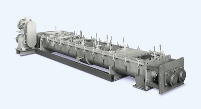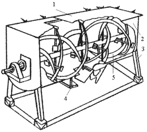 Двухроторный смеситель по конструкции представляет собой лопастной смеситель с двумя вращающимися роторами и с червячным разгрузочным узлом.