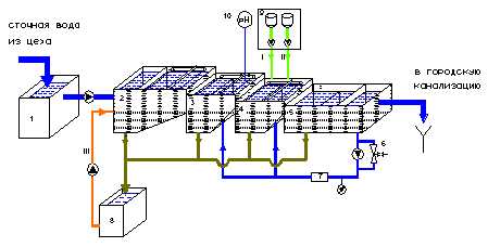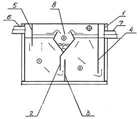 2. Очистные сооружения представляют собой набор емкостных технологических узлов, выполненных из унифицированных модульных элементов, отделения энергосилового оборудования, КИПиА и хим. контроля, коммуникаций, обеспечивающих весь комплекс процессов очистки сточных вод и обработки отходов очистки (шлама и осадков). Принципиальная технологическая схема наиболее экономичного варианта очистных сооружений показана на рисунке. Производственные сточные воды из цеха самотеком поступают в приемный колодец 1 (см. рис.), откуда насосом перекачиваются в жироловку 2. Последняя представляет собой секционный отстойник, оборудованный скребковым механизмом для сбора жирошлама. Выгрузка осадка из жироловки осуществляется под гидростатическим напором ("3м.в.ст.) или же с помощью эрлифта. Благодаря конструктивным особенностям жироловки степень очистки сточных вод составляет 60-80% по взвешенным веществам, 50-65% - по ХПК и БПК, до 80-85% - по жирам. Из жироловки осветленная вода самотеком поступает в напорный флотатор 3. После флотации вода самотеком поступает на реагентную обработку в отстойник 4, куда насосом-дозатором подаются раствор коагулянта и, при необходимости, раствор щелочи (для коррекции рН). Из реагентного отстойника 4 очищенная вода самотеком поступает во вторичный многосекционный отстойник 5 и далее сливается в городскую канализацию. Отстойники 4 и 5 оснащены тонкослойными модулями. Часть очищенной воды в количестве 10-30% от общего расхода насосом забирается из отстойника 5, насыщается воздухом в эжекторе 6 и через диспергатор 7 подается в нижний отдел флотатора 3. Флотатор 3 оборудован скребковым механизмом с электроприводом для сбора и удаления всплывшего флотошлама. Отходы очистки из флотатора, жироловки и отстойника удаляются в шламосборник 8 для сгущения с целью последующей их утилизации или удаления на полигоны хранения твердых бытовых отходов. Отстоявшаяся вода из шламосборника 8 возвращается дренажным насосом в 1-ю секцию жироловки. Комплекс очистных сооружений оснащается системой автоматического управления, сводящей к минимуму участие персонала в обслуживании оборудования. |